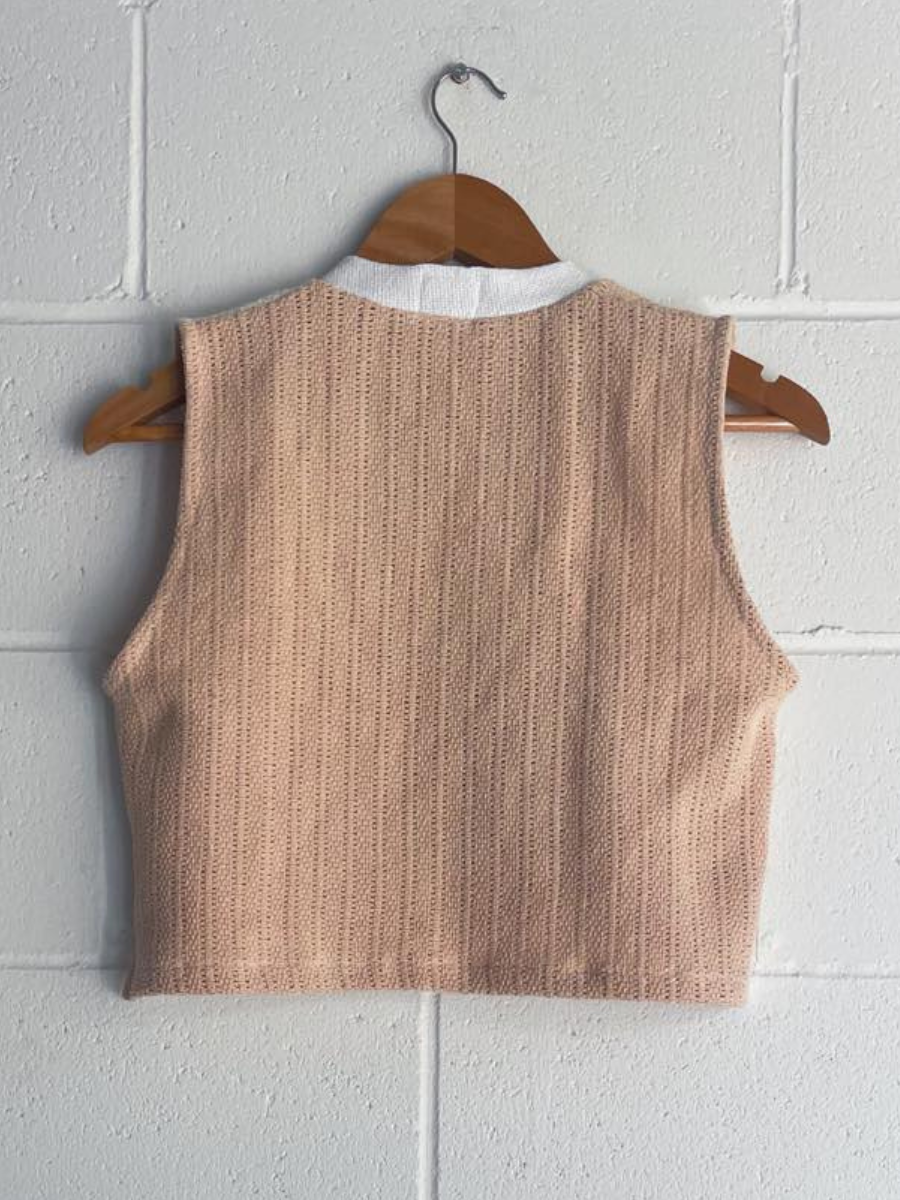 Bruns is a cropped, boxy style featuring side splits & contrast self-binding along the neckline